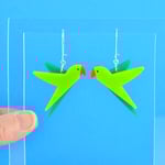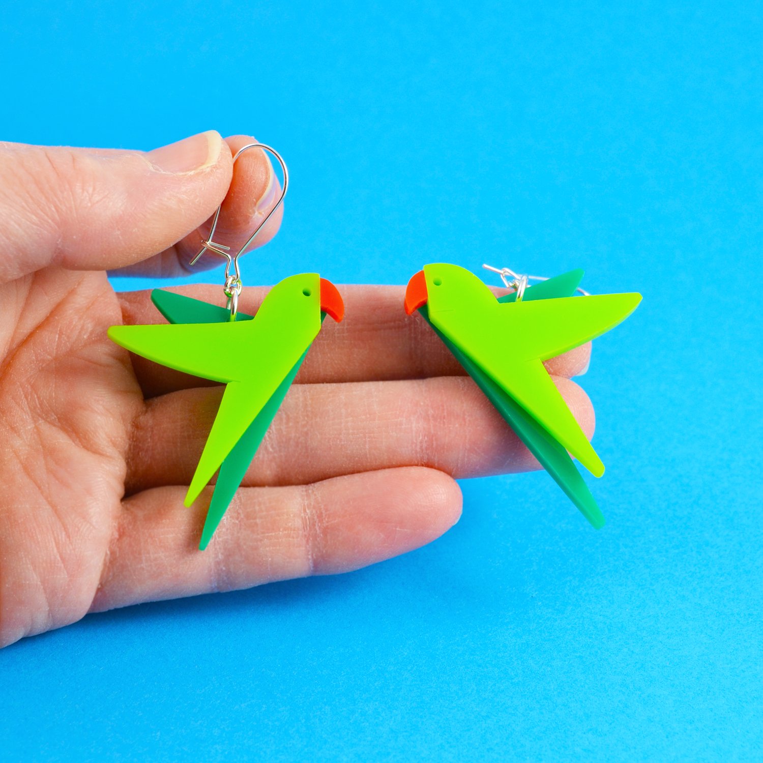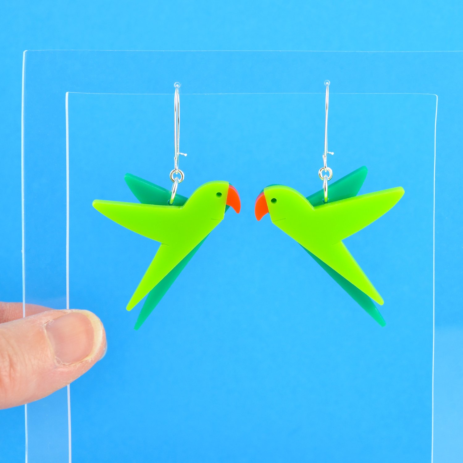 The parakeets measure approx 5cm from beak tip to tail end, and have a total dangle (with the earring wire) of 6.5cm